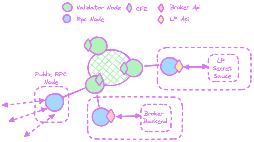 Brokers (and LPs) should ideally run their own local RPC nodes. These nodes connect to the network and expose the LP & Broker APIs locally to the backend they want to use.